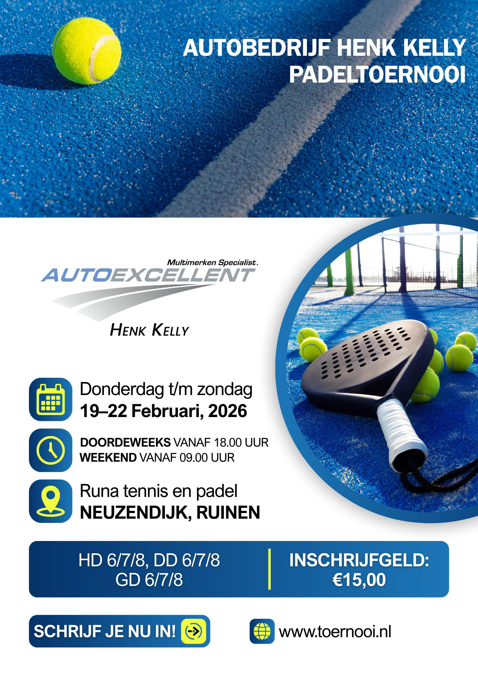 Van donderdag 19 februari t/m zondag 22 februari organiseert Runa Tennis & Padel het Autobedrijf Henk Kellij Padeltoernooi!